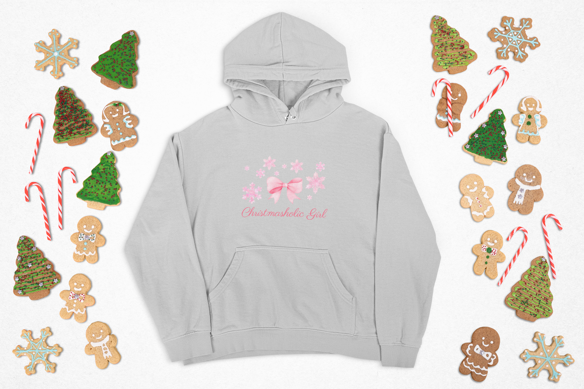 A soft, cozy hoodie with the sweetest touch of holiday magic. This fleece-lined piece features delicate snowflakes and pale pink bows for a gentle, aesthetic Christmas look. The double-layered hood, matching drawcord, and roomy kangaroo pocket keep you warm and comfortable all season long.